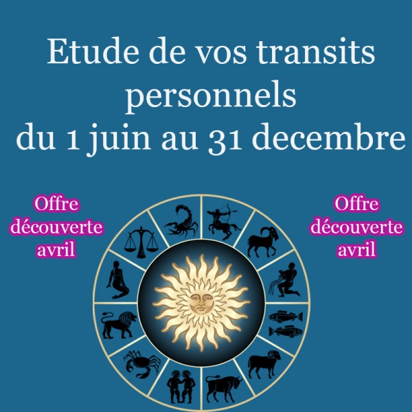 Chaque carte du ciel étant unique, il devient évident que les transits le sont aussi. Aussi, je vous propose une offre découverte qui va s’étendre sur 7 mois, de juin à decembre 2026, et qui va me permettre d’étudier vos transits personnels, mois par mois afin de faire ressortir les dates importantes et les conseils ou avertissements qui les accompagnent.